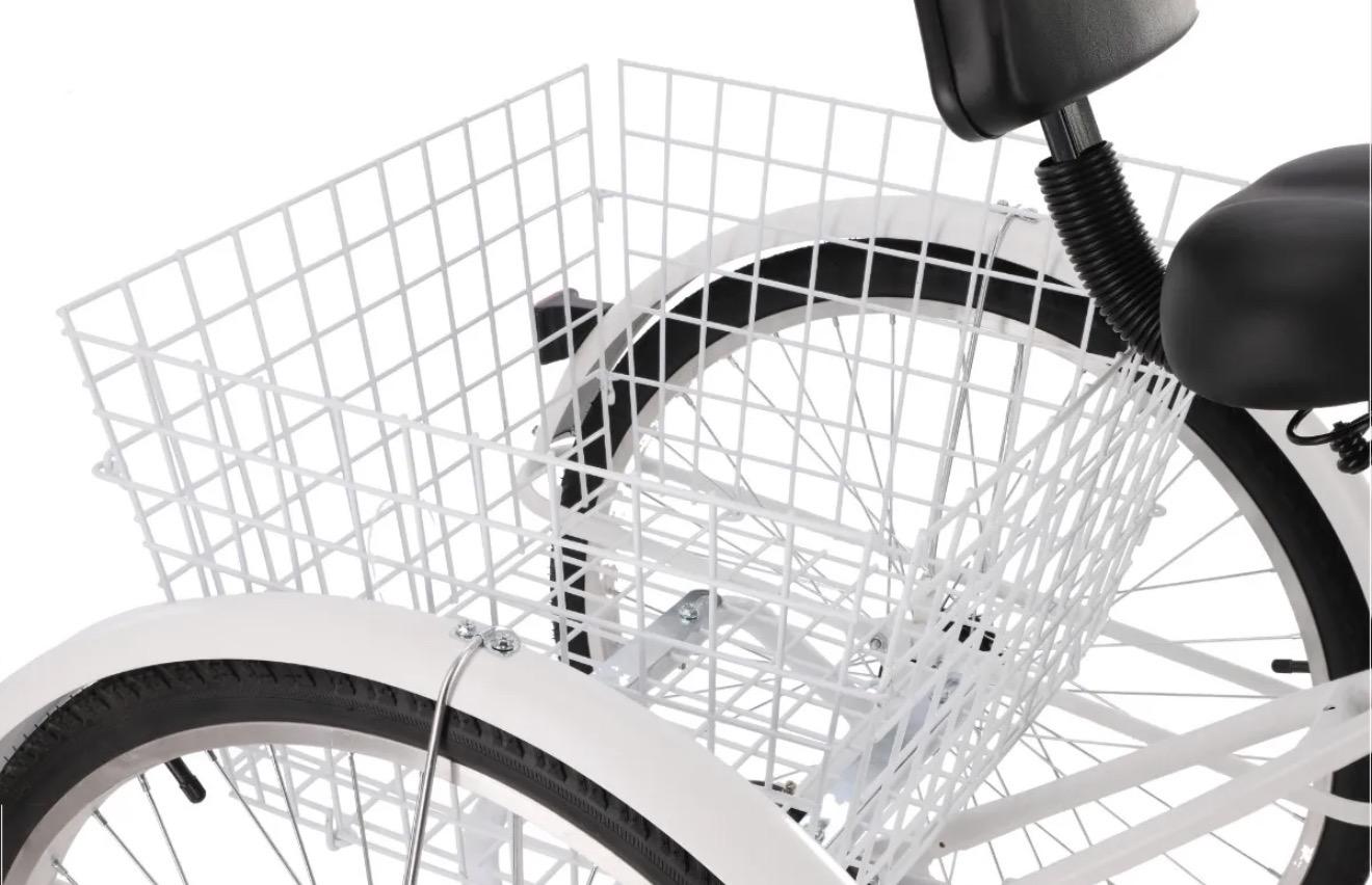 La tricicleta también cuenta con una canasta espaciosa montada en la parte trasera, lo que la convierte en una opción práctica para transportar objetos personales, compras o incluso una mochila. La canasta se asegura firmemente y es lo suficientemente amplia como para llevar artículos de tamaño mediano, lo que la convierte en una elección conveniente para aquellos que necesitan llevar cosas consigo mientras distrutan de su paseo en tricicleta.