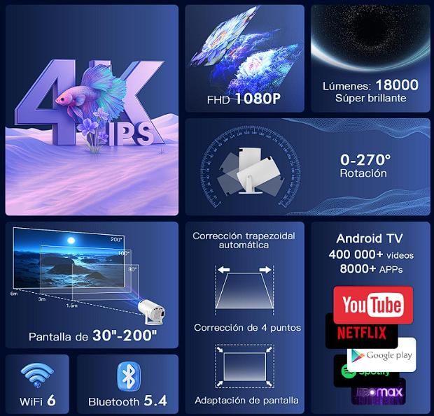 Características especiales 4K/Full HD 1080P, Apps Integradas Y Rotación de 270°, Corrección Vertical Automática Y Zoom del 100 %-50 %, Fuerte Compatibilidad Con Dispositivos, WiFi 6 Integrado, Bluetooth 5.4 Y Altavoz HIFI