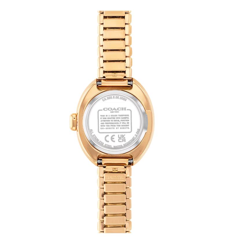 Atrévete a iluminar cada instante con el reloj Coach de la colección SAMMY, un diseño pensado para resaltar tu elegancia natural. Este reloj para mujer combina la distinción de su brazalete y caja dorados con una carátula ovalada de color negro que crea un contraste impactante, haciendo resaltar sus manecillas e índices dorados. El resultado es un estilo refinado y moderno, perfecto para acompañarte en reuniones, cenas o cualquier momento donde quieras destacar.