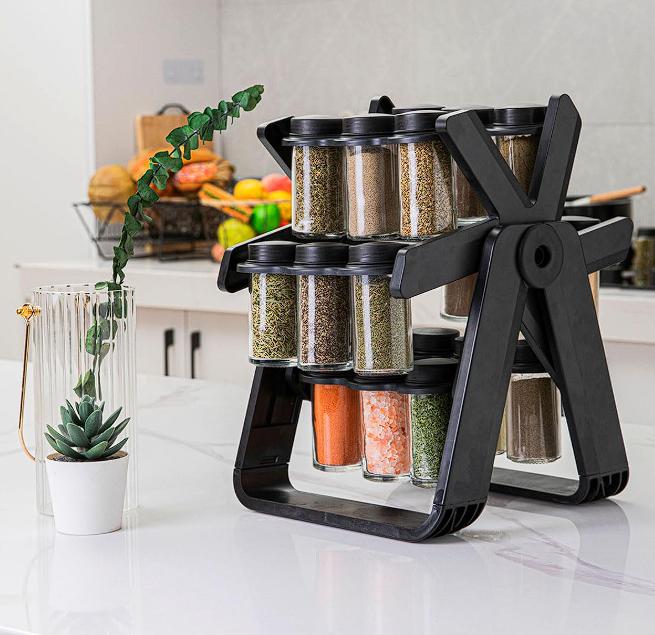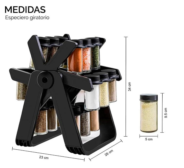Transforma tu cocina en un espacio moderno, funcional y perfectamente organizado con el Organizador de Especias Rotativo DEUS KITCHEN. Este completo set incluye 1 base giratoria, 18 frascos de vidrio con tapa, etiquetas para identificación y 1 embudo para rellenar fácilmente las especias, ofreciéndote una solución práctica y elegante para mantener tus condimentos siempre en orden y al alcance. La base giratoria tiene dimensiones de 26 cm de ancho x 23 cm de largo x 34 cm de alto, diseñada para ocupar el menor espacio posible en tu encimera o repisa. Gracias a su rotación de 360°, podrás acceder a cualquier especia con un solo movimiento, optimizando tiempo y espacio en tu cocina. Cada frasco tiene una medida de 5 cm de diámetro x 9.5 cm de alto y está fabricado en vidrio resistente, ideal para conservar el aroma, sabor y frescura de tus ingredientes.