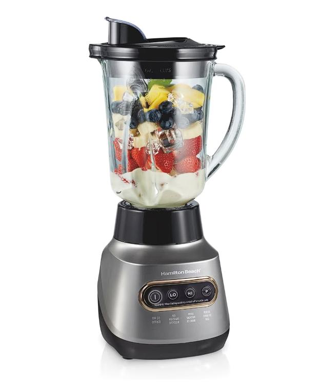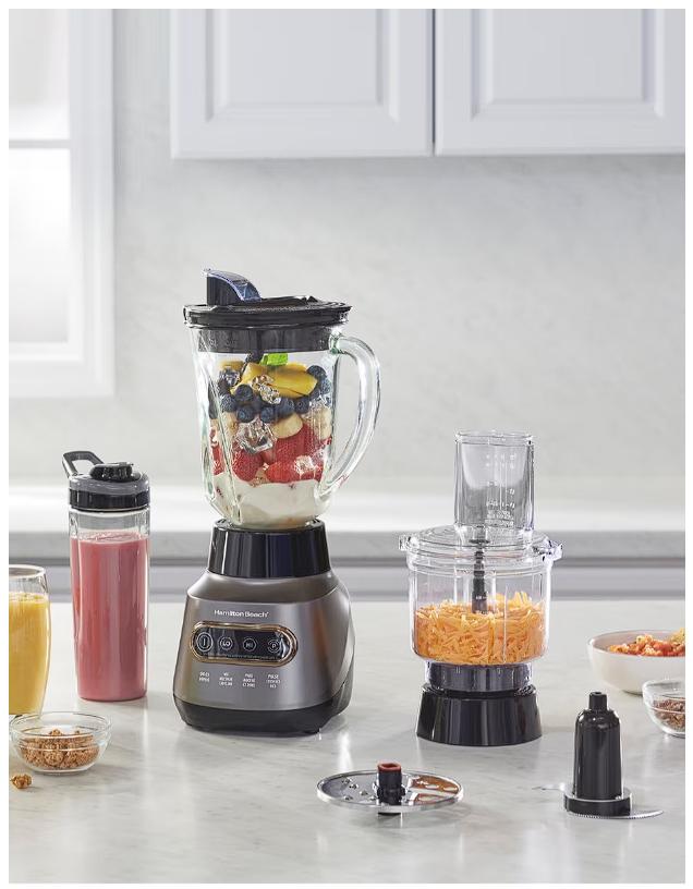 El versátil sistema electrónico de cocina 3 en 1 de Hamilton Beach funciona como tres electrodomésticos independientes: una licuadora tradicional, un procesador de alimentos y una licuadora personal para batidos. Cuenta con un potente motor de 800 watts de potencia máxima que tritura hielo, mezcla, pica, rebana, tritura y mucho más.