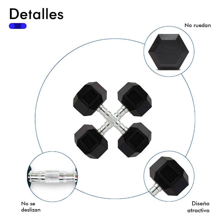 Con su diseño hexagonal, nuestras mancuernas se mantienen en su lugar sin rodar, permitiéndote concentrarte en tus ejercicios sin interrupciones. Aptas para levantamientos de pesas y ejercicios de fortalecimiento muscular, te permiten trabajar una variedad de grupos musculares para lograr resultados óptimos.