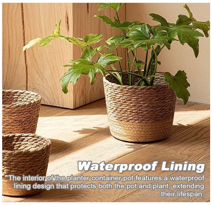 Estas cestas vienen en 3 tamaños para brindarte libertad creativa de decorar tu lienzo interior.Esta canasta para cubrir macetas está tejida a mano con materiales de césped natural, útil y liviana, segura de usar y preserva apariencia natural del césped.