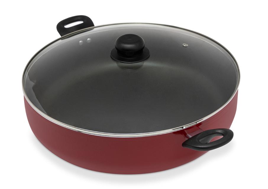 Se trata de una pieza con esmalte exterior rojo, fabricada de aluminio espesor extra fuerte, con antiadherente de 5 capas en su interior, con la que tienes la seguridad que no se va a pegar nada de lo que cocines. Sus asas están cubiertas de baquelita, para más comodidad. Además, cuenta con tapa de vidrio y capacidad de 10.5 litros.