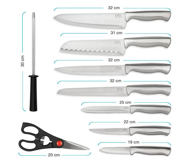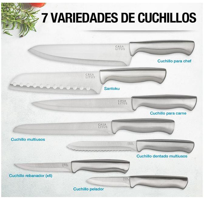EL MÁS COMPLETO SET DE CUCHILLOS PARA TU COCINA (15 PIEZAS): Expande tus habilidades culinarias con la variedad que te ofrece este set: un cuchillo de chef, un cuchillo estilo santoku, un cuchillo para carne, un cuchillo multiusos, un cuchillo dentado, 6 cuchillos para rebanar, un cuchillo para pelar y unas tijeras