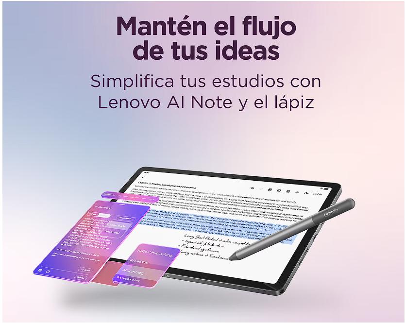 Su procesador ágil y pantalla 2.5K de 11" te ofrecen la fluidez y nitidez que necesitas en cualquier momento del día. Con una pantalla touch (2560x1600), 500 nits, antihuellas, memoria expandible y procesador veloz MediaTek Dimensity 6300 de 8 núcleos y su capacidad de memoria RAM de 8 GB y almacenamiento de 128 GB UFS, esta tableta Lenovo es perfecta para tomar apuntes, leer documentos o conectarte con tu equipo.