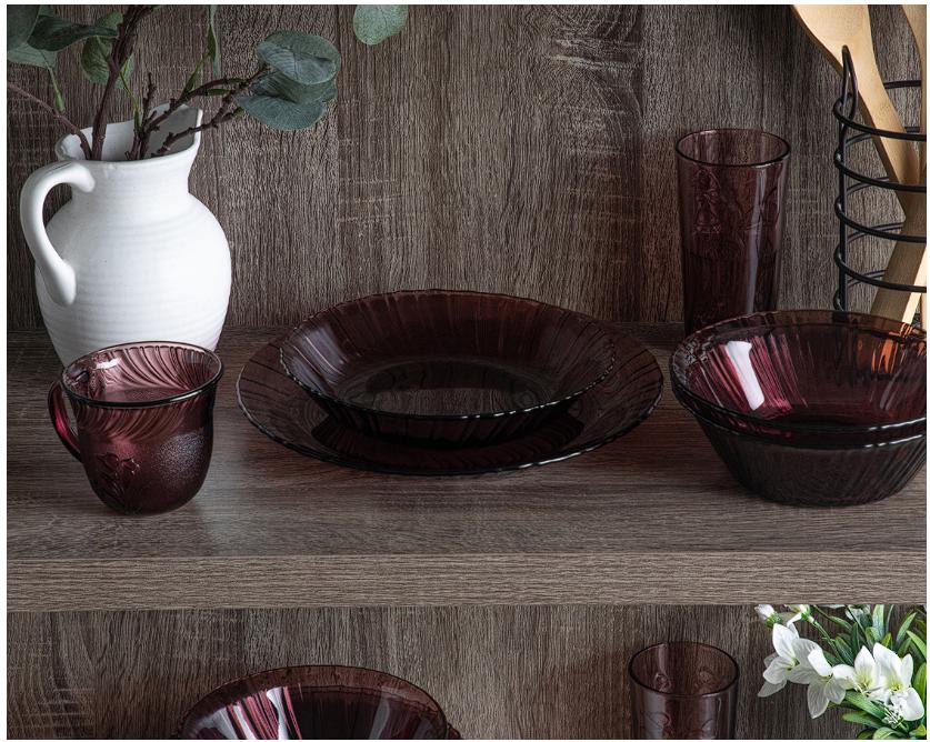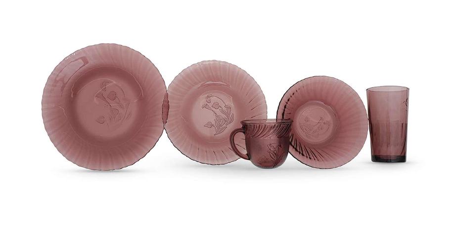 Está conformado por 20 piezas, entre las que destacan vasos, tazas, platos trinche, soperos y hondos. Están fabricados a base de vidrio, que te dan un toque clásico y elegante.