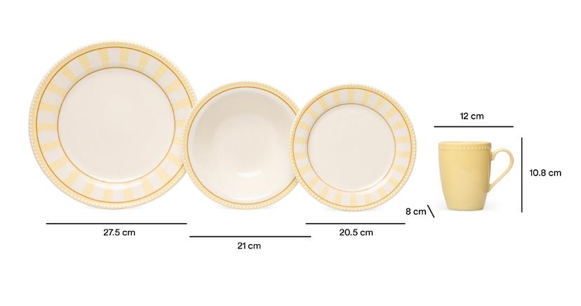 El diseño de 16 piezas incluye platos trinche, soperos, de postre y tazas para cuatro personas, con un alegre patrón de rayas amarillas. Su fabricación en cerámica garantiza durabilidad y una estética artesanal, que resalta la presentación de todas tus recetas favoritas.