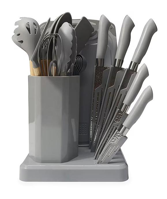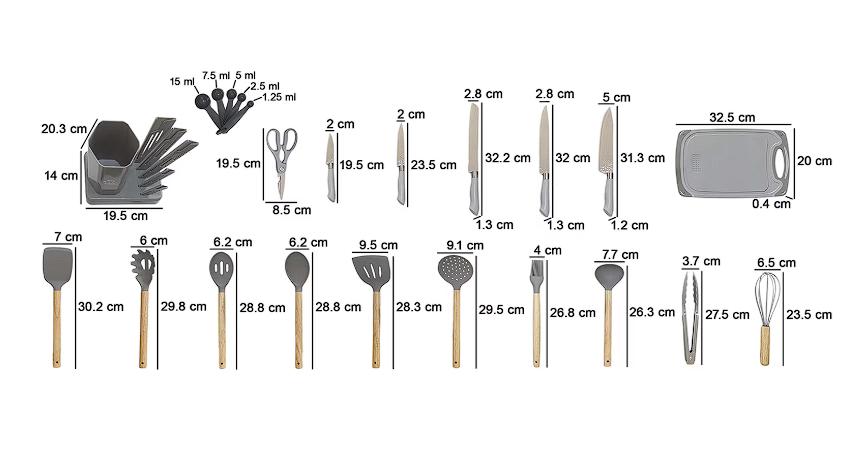 Incluye una base de plástico para tenerlo todo organizado, junto con tijeras y cucharas medidoras para una preparación precisa. Realiza tus recetas con un juego de 5 cuchillos de acero con mango de baquelita, con la ayuda de la tabla de cortar incluida. Además, el set cuenta con un surtido de utensilios de silicona con mangos de madera, como espátulas, una brocha de cocina, una pinza y un globo batidor.