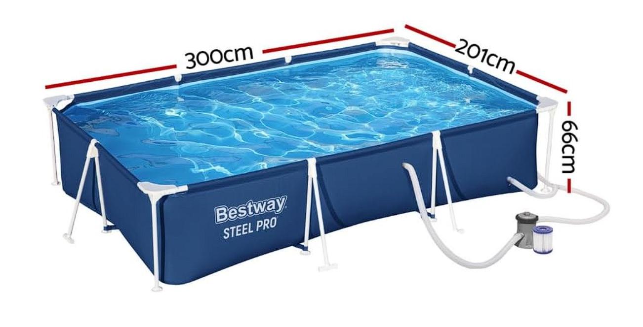 Especificaciones de la Alberca: medidas 3mX2.01mX66cm, capacidad 3,300 lts Peso del producto 20,16 Kilogramos