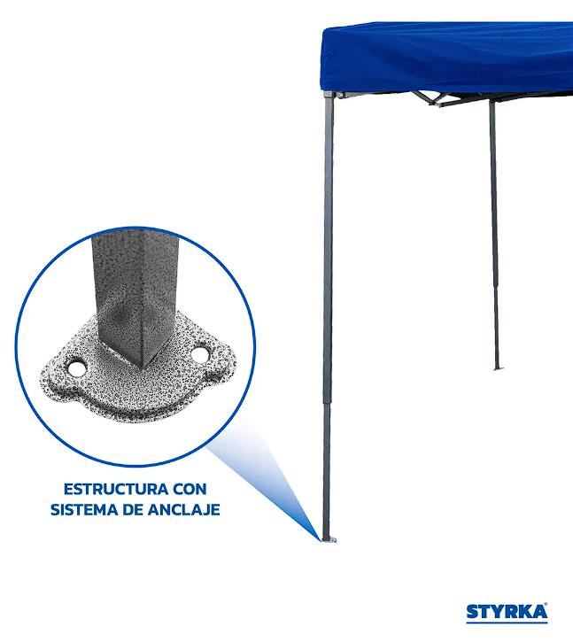 Lona impermeable para protección contra lluvias y vientos; estructura de acero con sistema de anclaje para fijación al suelo.