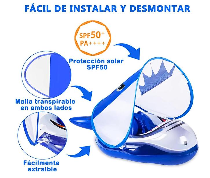 El flotador de Piscina para niño con dosel brinda protección solar UPF 50+, los lados son de malla transparente y visible para proteger la piel de su niño del sol, y el dosel es desmontable, sin importar en interiores o exteriores, disfrute nadando en cualquier momento y en cualquier lugar.