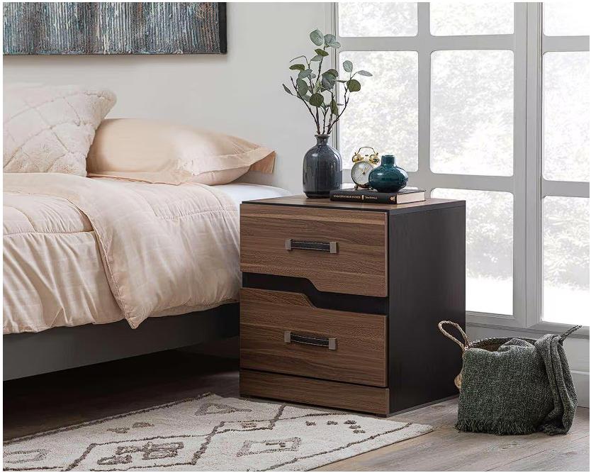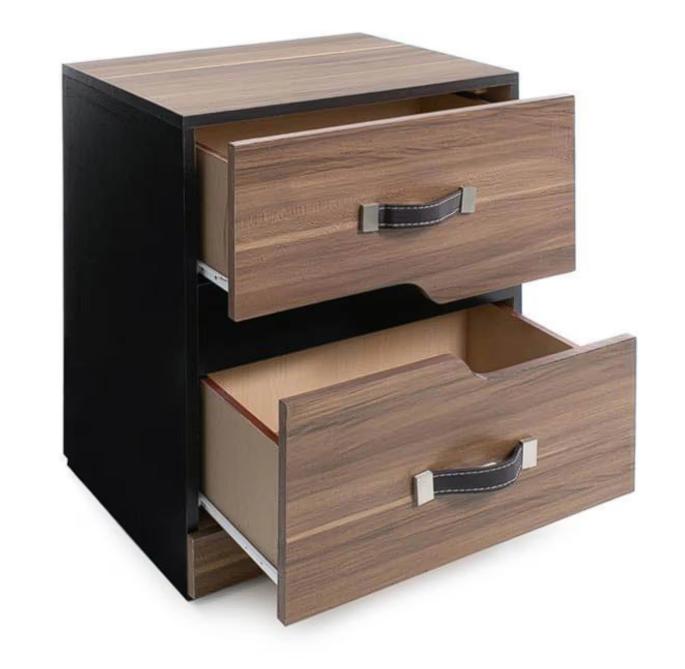 Es de color nogal/chocolate, con dos cajones amplios y jaladeras de tipo vinipiel con herrajes para darle un aire contemporáneo. Está elaborado con madera industrial y con terminado en melamina. Las correderas son metálicas y sus herrajes son niquelados.