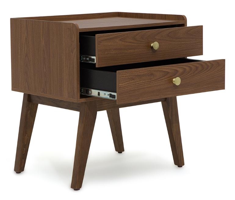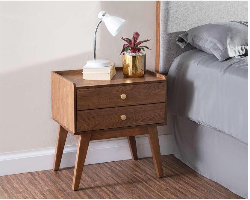 Este modelo está fabricado con madera industrializada con un acabado laminado de color nogal. Cuenta con dos cajones para que organices todas tus cosas sin problemas, ambos tienen jaladeras metálicas para darle un toque de brillo. Tiene unas medidas de 55 x 40 x 58.8 cm.