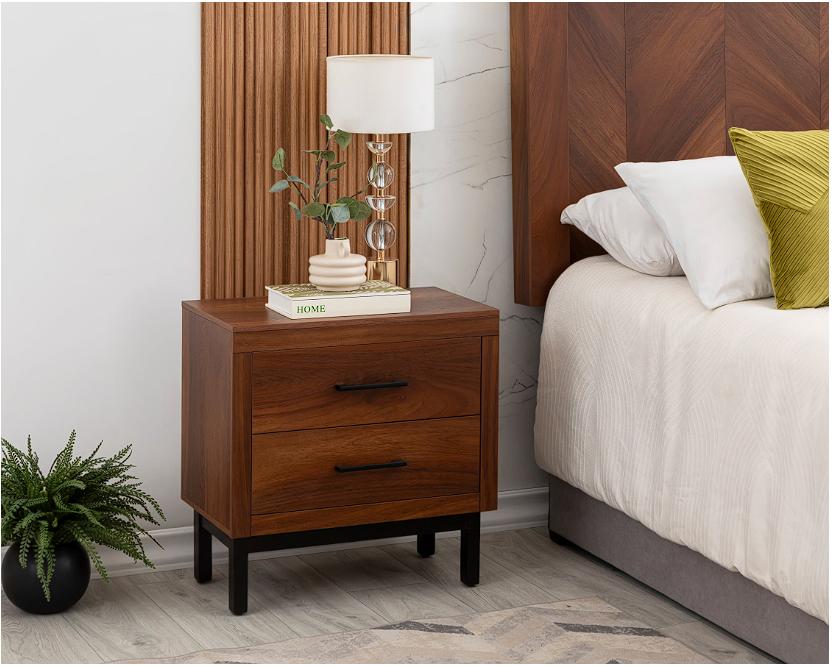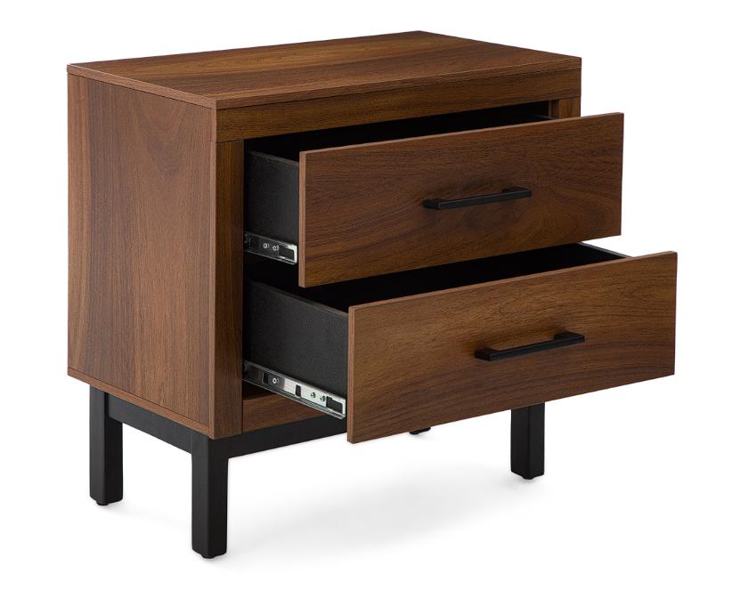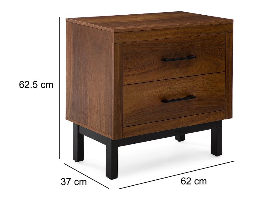 Está elaborado con madera industrializada de 12 mm con cubierta de melamina. Presenta dos cajones con jaladeras de metal y correderas tipo cisne.