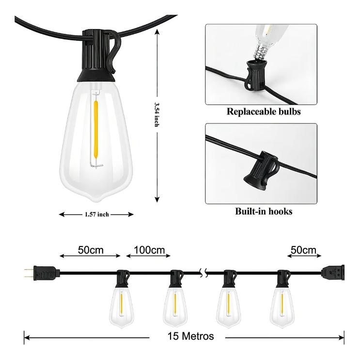Longitud total de 15m con 15 bombillas y 1 de repuesto.