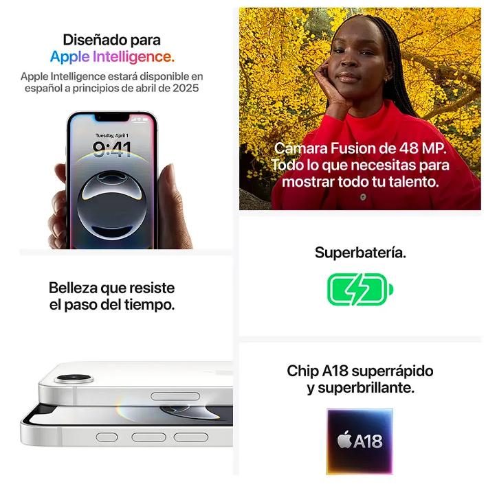 DISEÑADO PARA APPLE INTELLIGENCE — Personal, privado y poderoso. Escribe, exprésate y haz de todo con mucha facilidad. CHIP A18. A LA VELOCIDAD DEL FUTURO — El chip A18 te permite disfrutar Apple Intelligence, los juegos y las actualizaciones periódicas de iOS para que tu iPhone funcione como el primer día. SUPERBATERÍA — Manda mensajes, navega y disfruta hasta 26 horas de reproducción de video: la mayor duración de batería en un iPhone de 6.1 pulgadas. CÁMARAS — El sistema de cámara dos en uno cuenta con una cámara Fusion de 48 MP para fotos en superalta resolución y una cámara teleobjetivo de calidad óptica de 2x. Y toma increíbles selfies con la cámara frontal de 12 MP. DISEÑO RESISTENTE. PANTALLA IMPRESIONANTE — Una increíble pantalla de 6.1 pulgadas con tecnología OLED y frente de Ceramic Shield, más resistente que cualquier vidrio de smartphone. BOTÓN DE ACCIÓN — Personalízalo para acceder directamente a tus apps o funcionalidades favoritas, o para que Inteligencia Visual te ayud