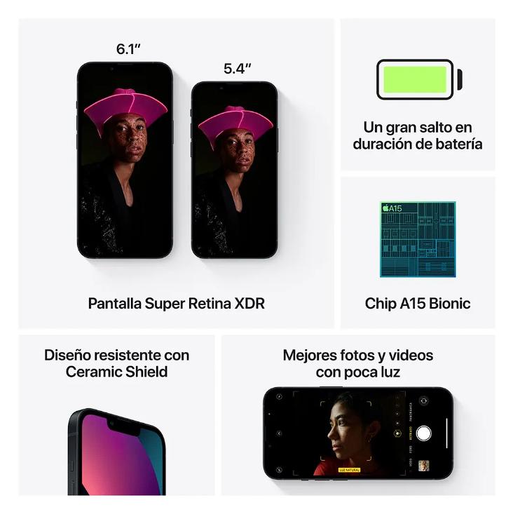 El iPhone 13 es un dispositivo con un sistema de dos cámaras (gran angular y ultra gran angular); mucho más avanzado que en cualquier otro iPhone. Cuenta con un chip A15 Bionic, que garantiza una rapidez excepcional, tanto para saltar de aplicaciones, como para jugar como un gamer profesional.