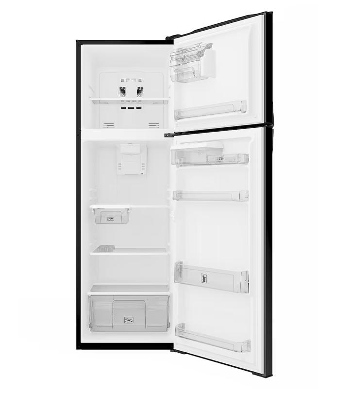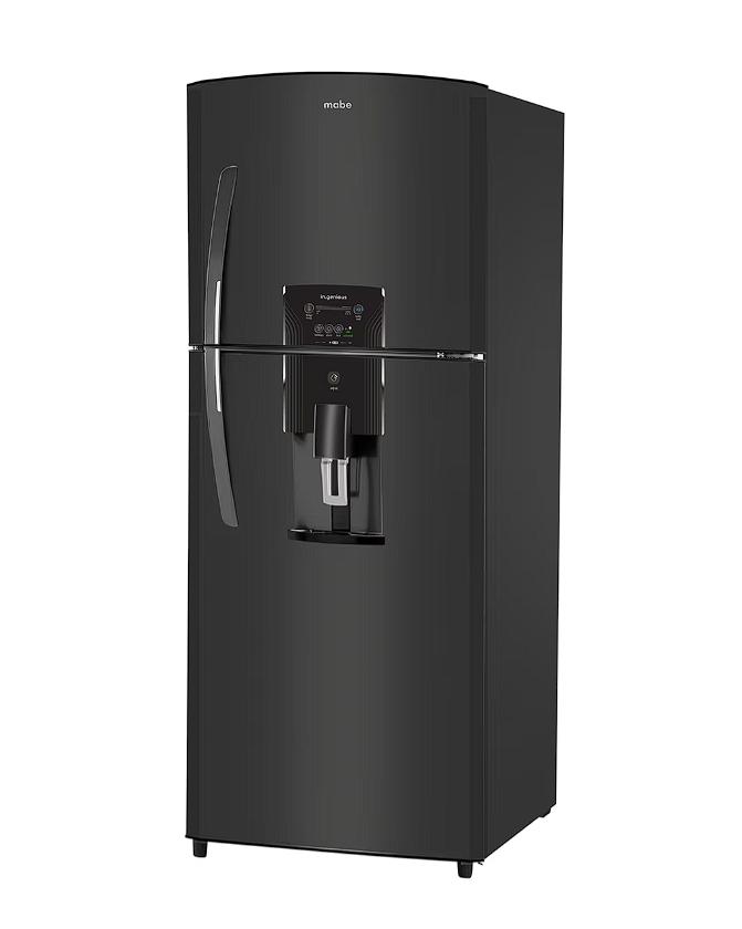 Refrigerador Mabe Top Mount de 11 pies cúbicos negro con display táctil, despachador de agua 2 L, jaladera soft touch, con ahorro de energía, mejor conservación y mayor frescura en los alimentos gracias a la tecnología Home Energy Saver; en enfriador cuenta con 2 parrillas de cristal templado, 2 anaqueles completos en puerta, 1 cajón legumbrero y 1 para carnes frías, huevera y luz LED, en congelador cuenta con 1 parrilla de cristal templado, 2 anaqueles en puerta y desmoldador de hielo