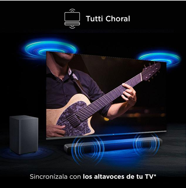 Barra de sonido TCL S55H; El altavoz Hi-Fi del soundbar S55H cuenta con altavoz de gran fidelidad, sistema de mejora de bajos dual y una calibración de sonido óptima, todo en un solo producto. Además, ofrece cámaras de eco de doble bocina para mejorar la amplitud de los bajos, para ofrecer una sensación equivalente a un subwoofer e incluye un subwoofer inalámbrico de 120W con diseño de textura integrado. También contarás con las mejores tecnologías como Dolby Atmos, Tutti Choral, sonido adaptativo con IA y compatibilidad con Google TV y Roku TV.