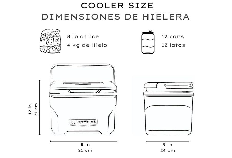 Con capacidad para almacenar hasta 12 latas (sin espacio para hielo). Si se llena la hielera solamente con hielo y se mantiene en un lugar fresco, tiene una duración de hielo de hasta 48 horas.