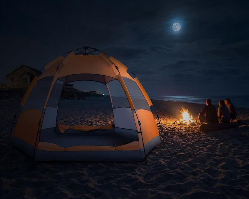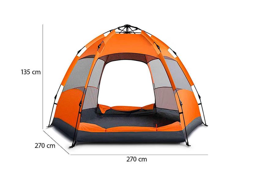 De color anaranjado, es muy fácil de montar y desmontar. Está hecha con poliéster 170t, con revestimiento para mayor protección, e incluye cuerdas de sujeción y clavijas para mantenerla segura en el suelo. Mide 270 x 270 x 135 cm.