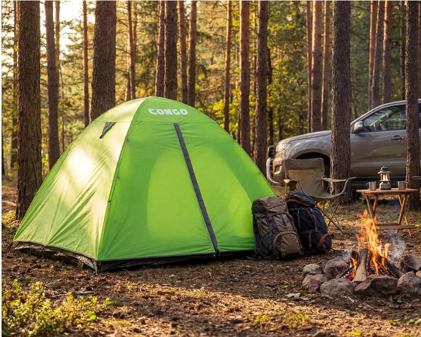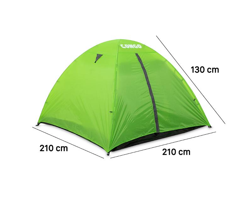 Es de color verde y tiene unas medidas de 210 x 210 x 130 cm, lo que la hace perfecta para 4 personas. Tiene un diseño impermeable y cuenta con cierre de cremallera. Al compactarse, puede volverse a guardar en su práctica bolsa con asa y ajuste de cordón.