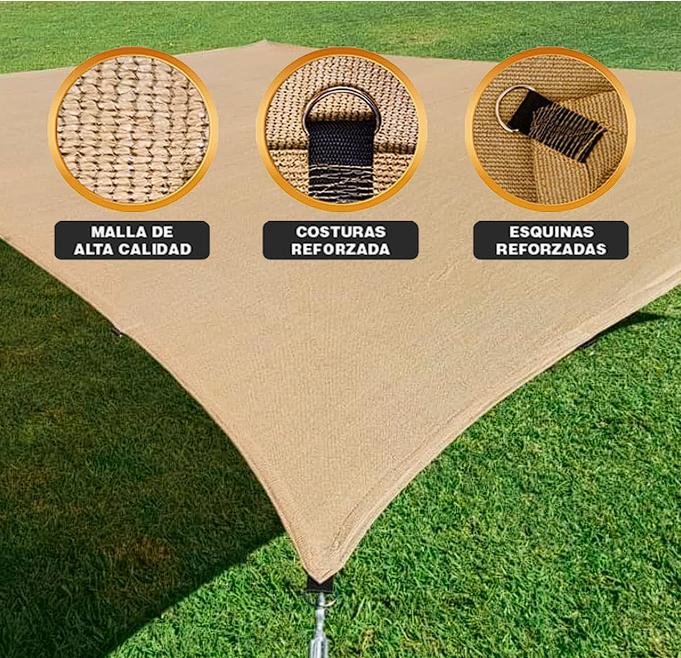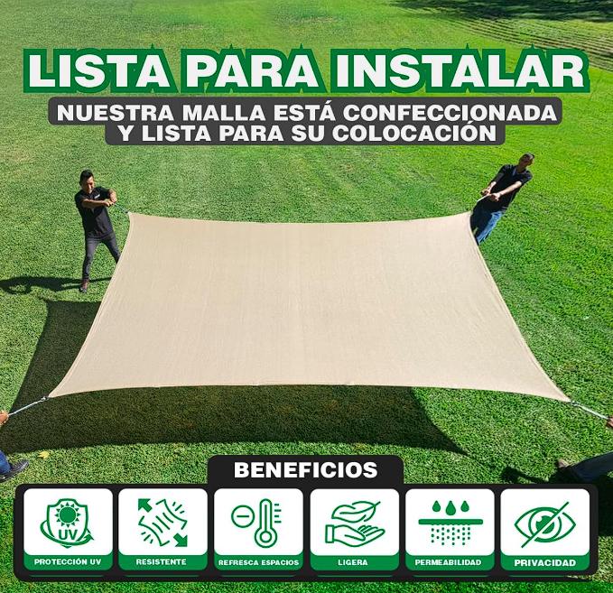 Malla sombra tipo raschel 90% de sombra Reforzada En las cuatro esquinas el reforzado esta formado con malla monofilamento tapado con lona reforzada, para mayor resistencia y un acabado estético Sujetadores con bastillas de 5cm de mayor espesor que las convencionales Sujetadores cada 80 - 85 cm en los lados Doble costura con hilo de polietileno resistente al sol con el mismo hilo que son fabricadas las mallas