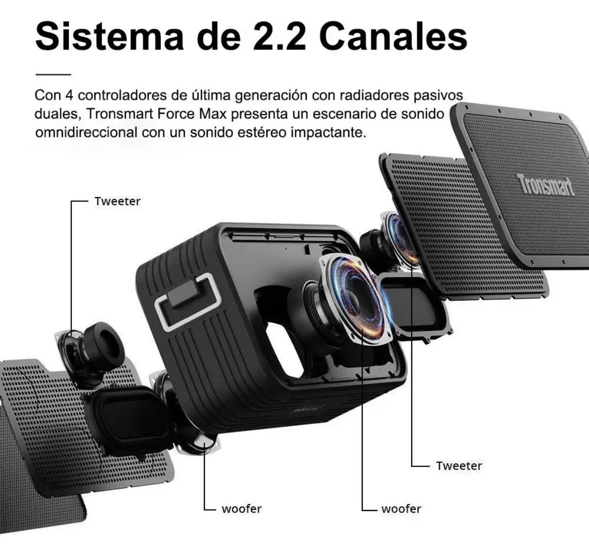 Tronsmart Force Max — Bocina Bluetooth de 80 W con audio de tres frecuencias y sistema de 2.2 canales que ofrece una experiencia estéreo inmersiva en cualquier lugar. Disfruta de efectos de ecualización con graves, vocal bajos y 3D graves profundos. El altavoz de alta definición de 80 W proporciona un volumen considerable, adecuado para reuniones en interiores y exteriores en diversos escenarios. Con tecnología SoundPulse Audio, presenta audio estéreo fuerte sin distorsión incluso a alto volumen.