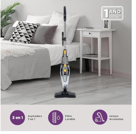 Incluye accesorios que permiten la limpieza de escaleras, tapetes, alfombras, sillones, camas, cortinas y los interiores de un automóvil.