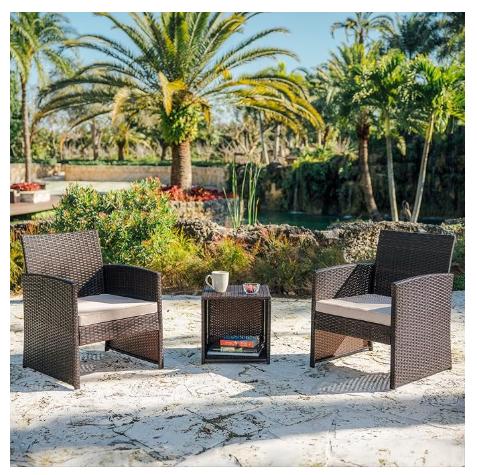 Juego de muebles de patio de mimbre: tu santuario al aire última intervensión espera con nuestro juego de muebles de patio de 3 piezas que tiene capacidad para 2 personas, completo con sillas de patio juego de 2 y una mesa auxiliar resistente para aperitivos y bebidas con un estante de acceso abierto para un almacenamiento cómodo.