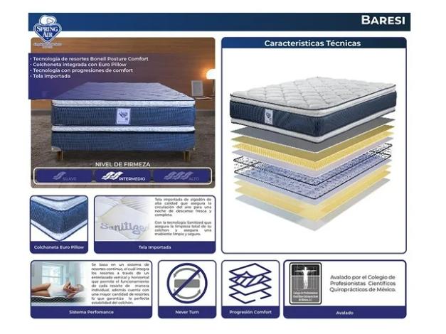 Posture Comfort, con resortes mejorados geométricamente, proporciona un 20% de más firmeza.Nuestras tecnologías no solo maximizan la durabilidad del colchón, sino que también previene deformaciones a lo largo del tiempo, garantizando un descanso profundo y de alta calidad. ¡Invierte en un soporte que perdura y disfruta de un confort superior cada noche! Colchoneta de altura funcional tipo Pillow Top en ambos lados, diseñada para prolongar la vida útil del colchón, proporcionando el confort adecuado para un descanso profundo. El sistema con progresiones de confort, basado en capas de espuma, maximizan el soporte lumbar y comodidad, eliminando los puntos de presión en hombros, caderas y pies.Tela hipoalergénica con tecnología SANITIZED: Microcápsulas con Sanitized que mantiene tu colchón libre de microorganismos dañinos. Nivel de firmeza: Intermedio (Semi firme). Gracias a su confort lumbar Spring Air está avalado por el Colegio de Profesionistas Científicos Quiroprácticos de México.
