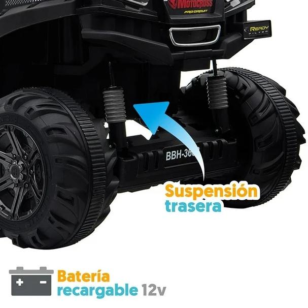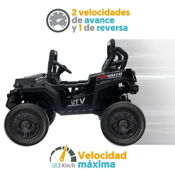 ¡Presentamos el UTV Negro 12V Montable, la elección ideal para que los pequeños aventureros disfruten de una experiencia de conducción emocionante y segura! Este vehículo montable combina características interactivas con un diseño resistente, garantizando horas de diversión. Características Destacadas: Sonidos al Volante: Proporciona una experiencia de conducción realista con sonidos integrados en el volante, añadiendo un toque extra de emoción. Función MP3: Incluye una función MP3 para que los niños puedan disfrutar de su música favorita mientras conducen. Luces Traseras y Delanteras: Equipado con luces traseras y delanteras funcionales, mejora la visibilidad y añade realismo al juego. Peso Máximo: Soporta hasta 30 kg, asegurando que sea apto para una amplia gama de pequeños conductores. Velocidad Máxima: Con una velocidad máxima de 3 km/h, garantiza una conducción segura y controlada. Información Adicional: Potencia: 12 Volts, ofreciendo un rendimiento consistente y fiable. ¡Elige el