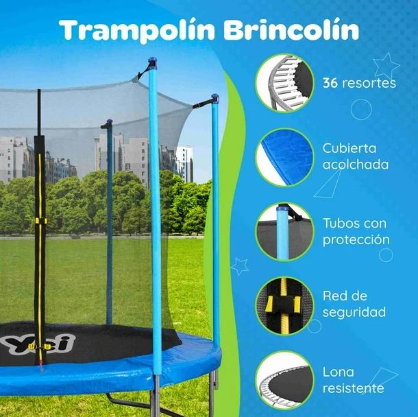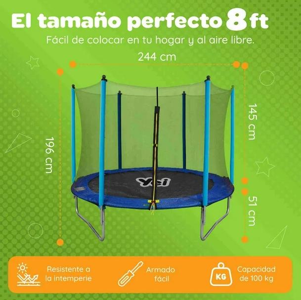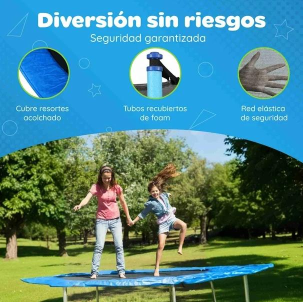 Este Trampolín es seguro debido a su estabilidad y materiales. Ideal para la familia por su gran tamaño. Cuenta con marco de acero galvanizado resistente a la corrosión, con 6 postes acolchados de espuma, así como malla de protección con doble cierre con cremallera y hebilla para la seguridad de los más pequeños. Elaborado con lona de alto impacto resistente a rayos UV y al agua, con 42 resortes de alta resistencia cubiertos con una almohadilla de seguridad gruesa. Esto hace que la cama elástica sea de excelente rendimiento de salto, con una capacidad máxima de carga de 150 kg. La altura de la red protectora es de 146 cm, lo que aumenta la altura del salto de los niños, garantizando la seguridad. Excelente rendimiento de rebote: 42 resortes resistentes al óxido de 13 cm, son más duraderos, tienen una elasticidad duradera sin deformación y rebotan más rápido. El lona de rebote de polipropileno de alta calidad es más antideslizante, resistente al desgaste, fuerte y transpirable, además e