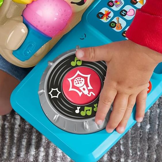Pulsa los botones de letras de la mesa de DJ y gira el tocadiscos para activar la música, los sonidos y las frases divertidas; el micrófono luminoso se sincroniza con el ritmo