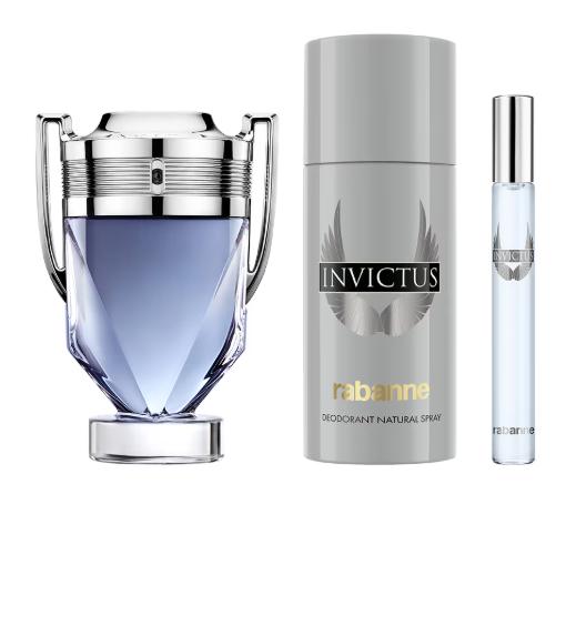 Estas fiestas, encuentra tu superestrella Rabanne. Rabanne captura la magia de los códigos icónicos de la Maison. Cada uno se convierte en una constelación que cuenta su propia historia única. En el corazón de este precioso regalo, la estrella dorada de Rabanne deslumbra e ilumina la noche. Descubre Invictus Eau de Toilette 100 ml combinado con el desodorante en spray 150 ml y el spray de viaje 10 ml para unas fiestas audaces y brillantes. Una fragancia ganadora, fresca y amaderada. Con notas de pomelo y madera de guayaco, se combinan con la frescura cítrica para crear una fragancia sensual y melancólica.