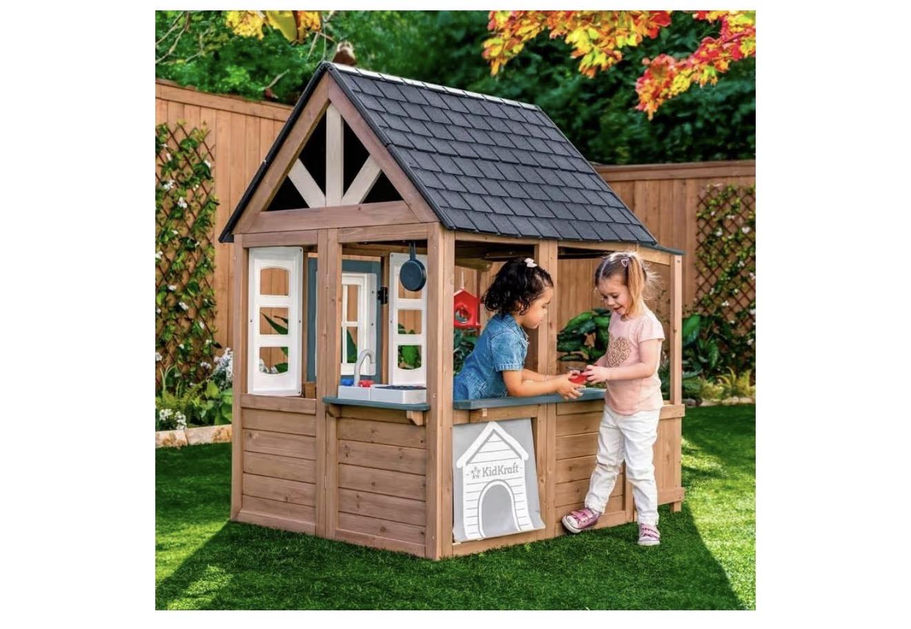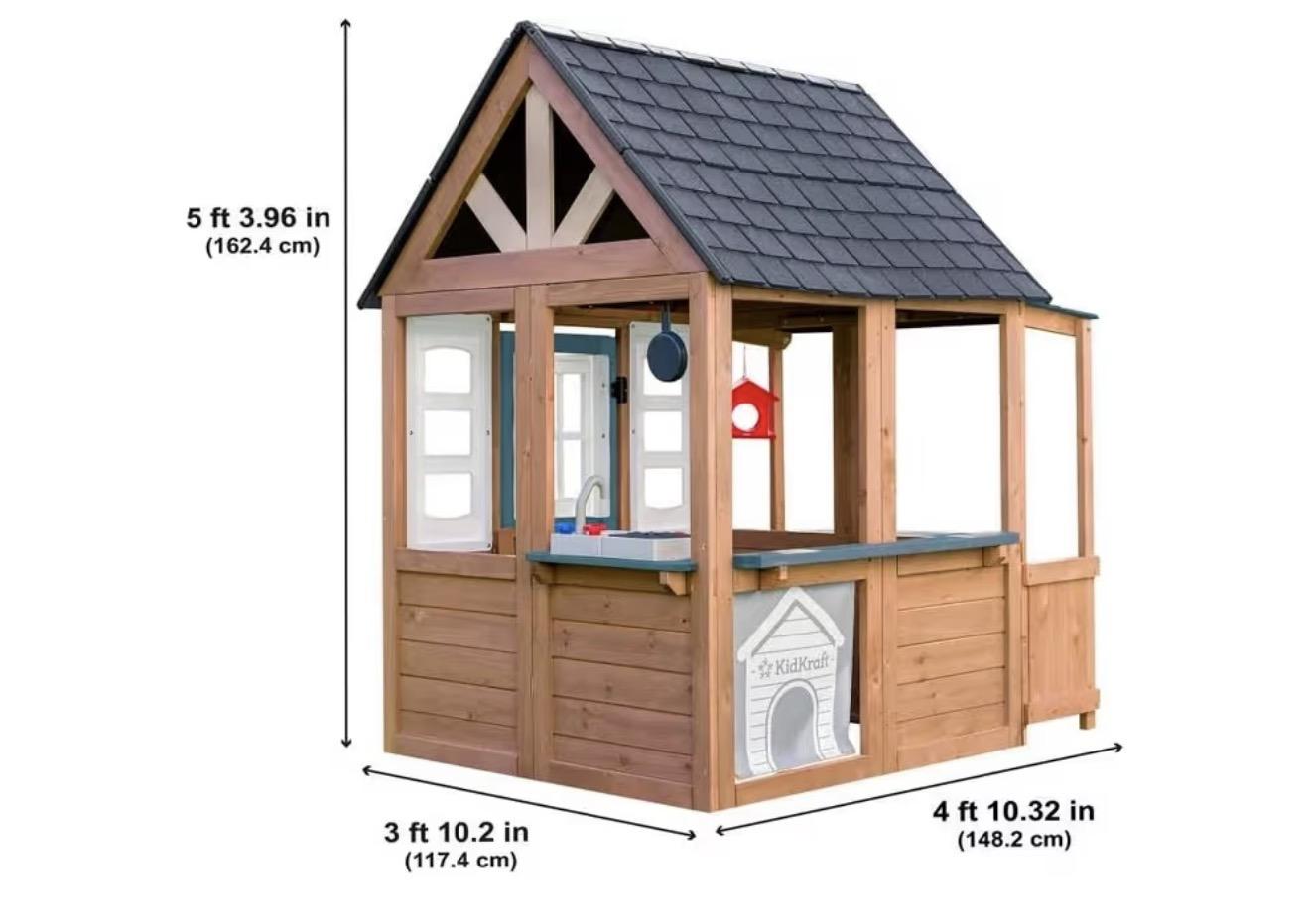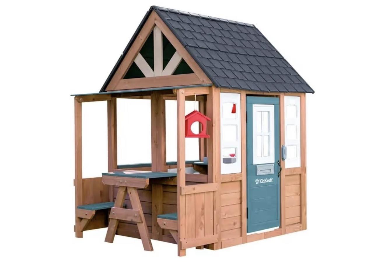 Casita de Juegos de Madera para Exterior, con Cocina, Mesa de Picnic y Bancos