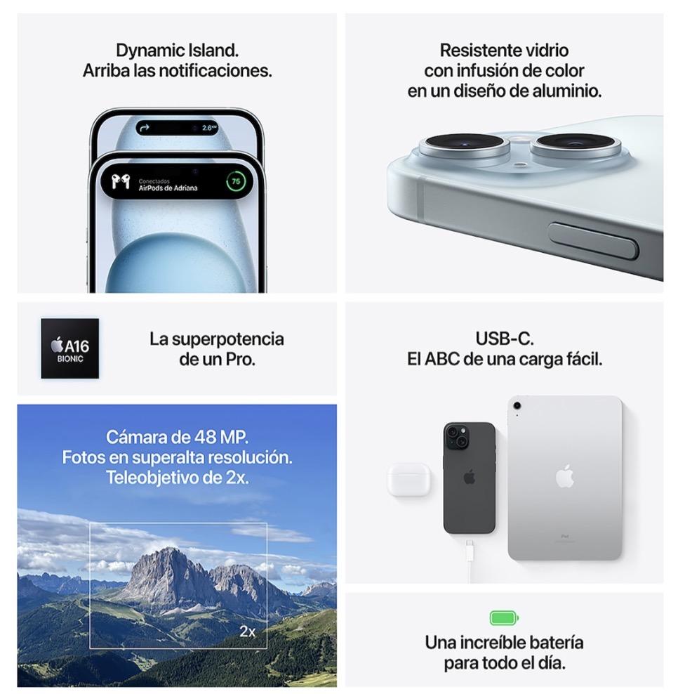 DISEÑO INNOVADOR. El iPhone 15 tiene un robusto vidrio con infusión de color en un diseño de aluminio. Es resistente a las salpicaduras, al agua y al polvo, y viene con frente de Ceramic Shield, más duro que cualquier vidrio de smartphone. Además, lo pantalla Super Retina XDR de 6.l pulgadas es hasta dos veces más brillante bajo el sol en comparación con el iPhone 14.