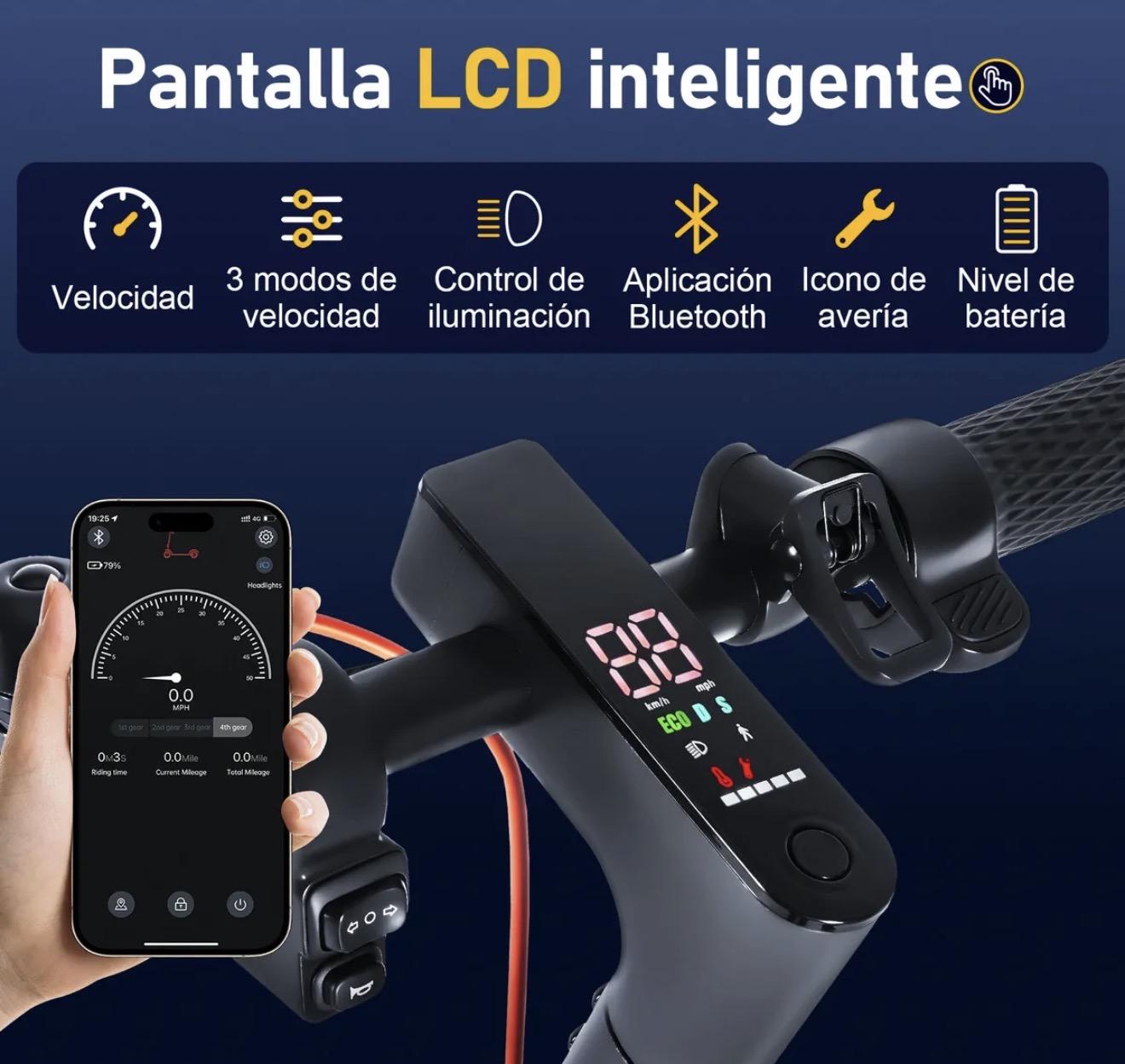 -Contenido de la pantalla del medidor: Velocidad, Modo de Velocidad, Nivel de Batería, Faro, Bluetooth