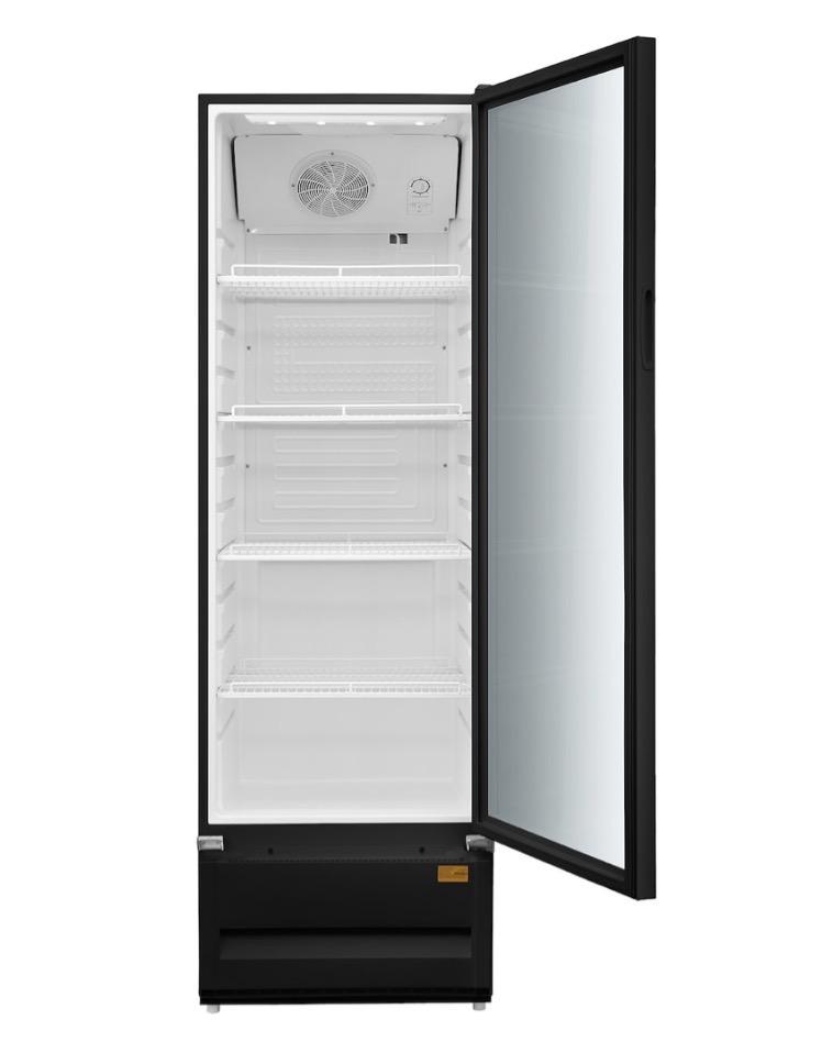 Con una generosa capacidad de 309 litros (11 pies), este refrigerador te brinda el espacio ideal para almacenar bebidas, alimentos y productos de manera organizada. Su elegante color negro y su diseño de una puerta de vidrio se adapta a cualquier espacio, desde tiendas hasta restaurantes.