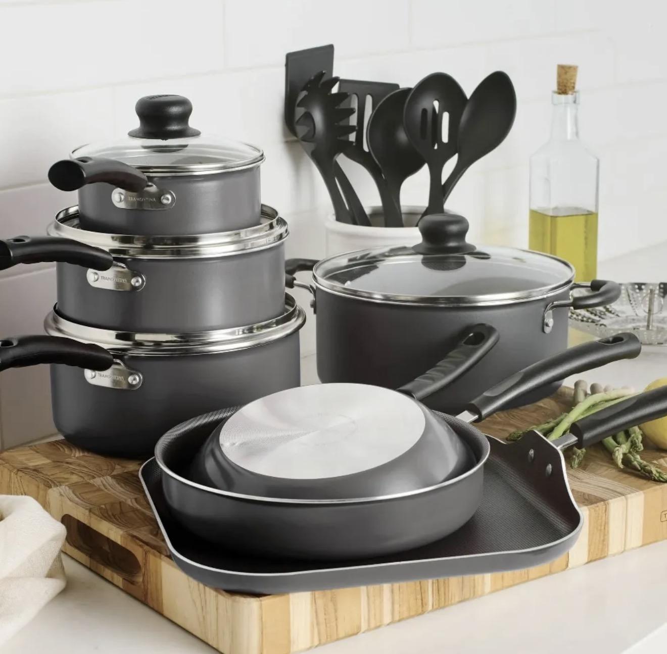 Elementos incluidos 1 sartén de 20 cm, 1 sartén de 23 cm, 1 plancha de 28 cm, 1 sartén de 1 L con tapa, 1 sartén de 1.9 L con tapa, 1 sartén de 2.83 L con tapa, 1 sartén de 3.7 L con tapa, 1 vaporizador plegable de acero inoxidable, 1 cuchara sólida, 1 cuchara ranurada, 1 espátula ranurada, 1 espátula, 1 cuchara de pasta, 1 cucharón, 4 cucharones y 2 volteadores de color azul