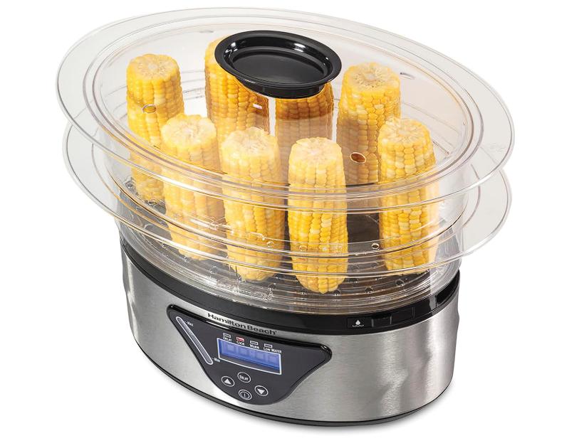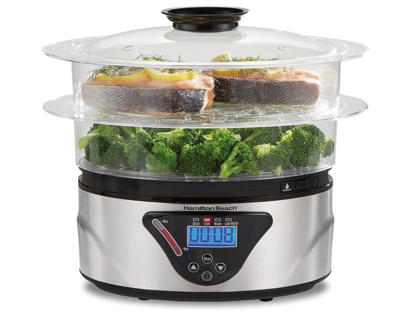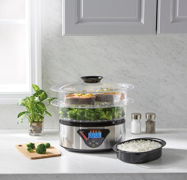 Solamente, llénala con agua, coloca uno o dos tazones transparentes llenos de comida encima de la base y configura el temporizador de cocción.