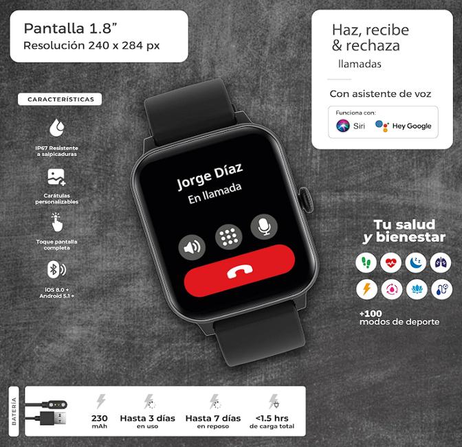 Pantalla HD de 1.8": Disfruta de una visualización clara y vibrante con la amplia pantalla de alta definición, que facilita la navegación y lectura de notificaciones.