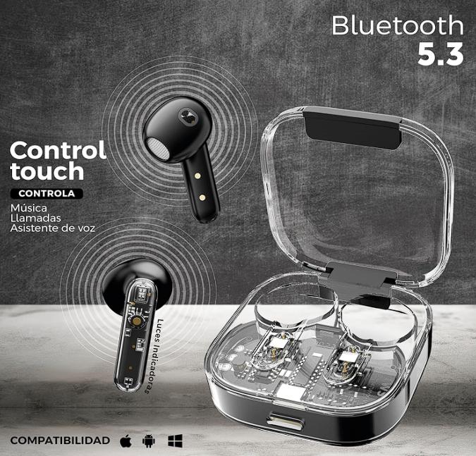 Audífonos inalámbricos Onepops Funky Transparentes: Incluye audífonos con diseño transparente y control táctil, ofreciendo una experiencia de audio envolvente y facilidad de uso.