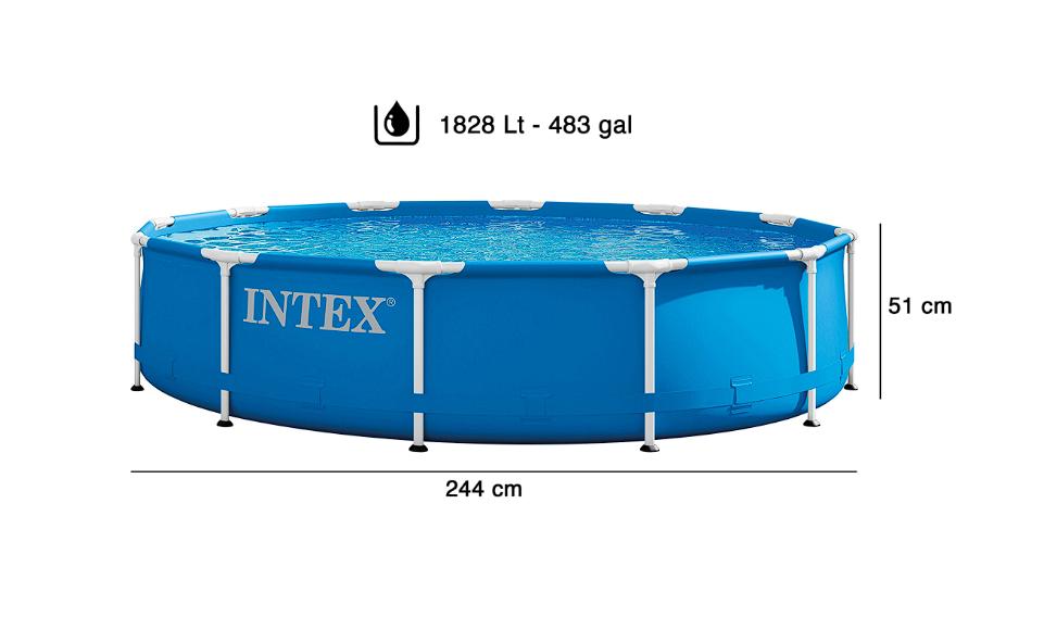 Este modelo viene en color azul, es circular y tiene una capacidad máxima de 1828 litros. Está fabricado en PVC y cuenta con estructura de acero armable, resistente a la corrosión. Además, tiene medidas de 244 x 51 cm y el empaque mide 26 x 18 x 95 cm.