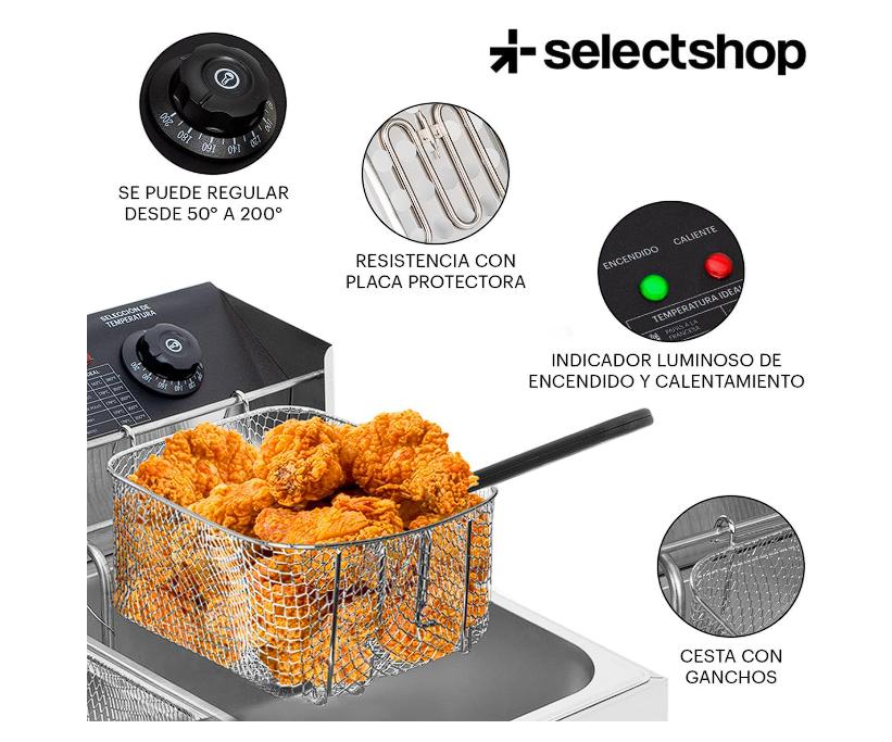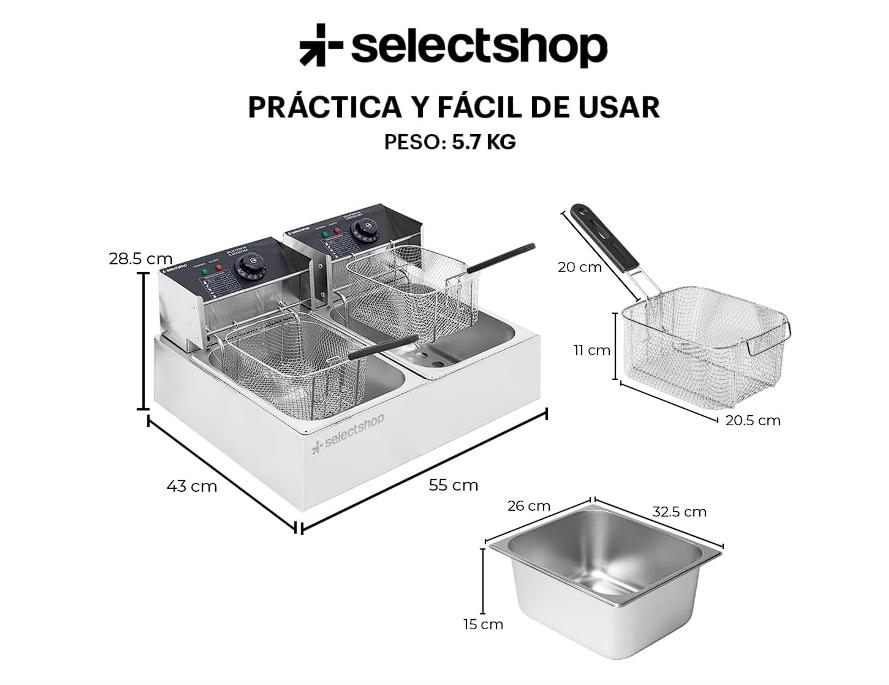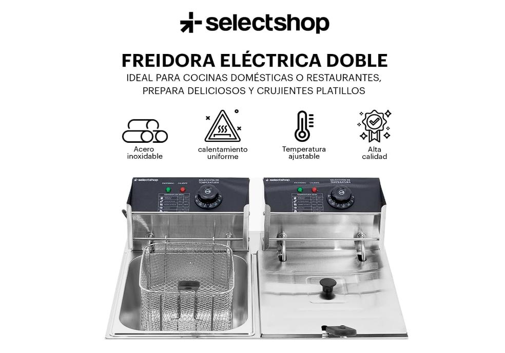 Prepara deliciosos y crujientes platillos con la freidora eléctrica de doble bandeja. Cocina papas fritas, pollo crujiente, bistec, muslos de pollo, plátanos, camarones, pescado, alitas de pollo o anillos de cebolla. Es un producto que no puede faltar en tu negocio ni en tu hogar.
