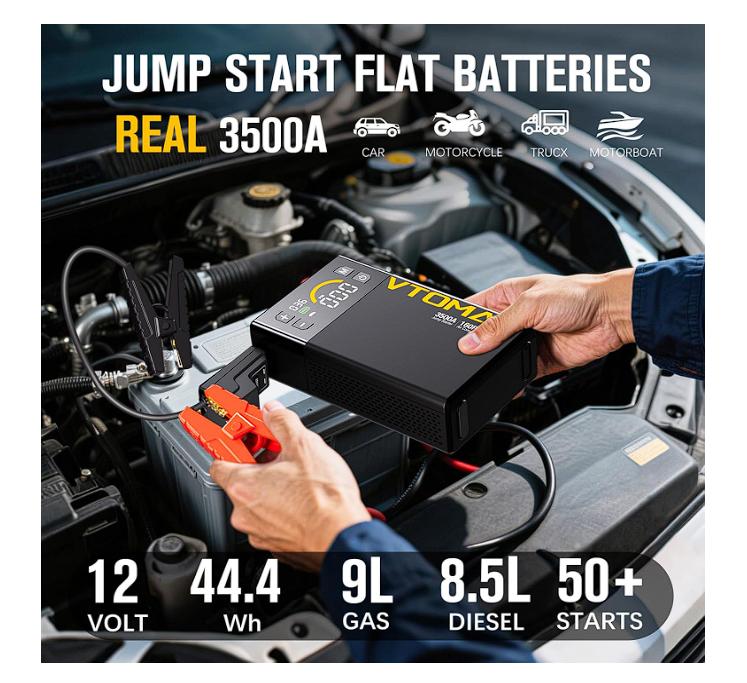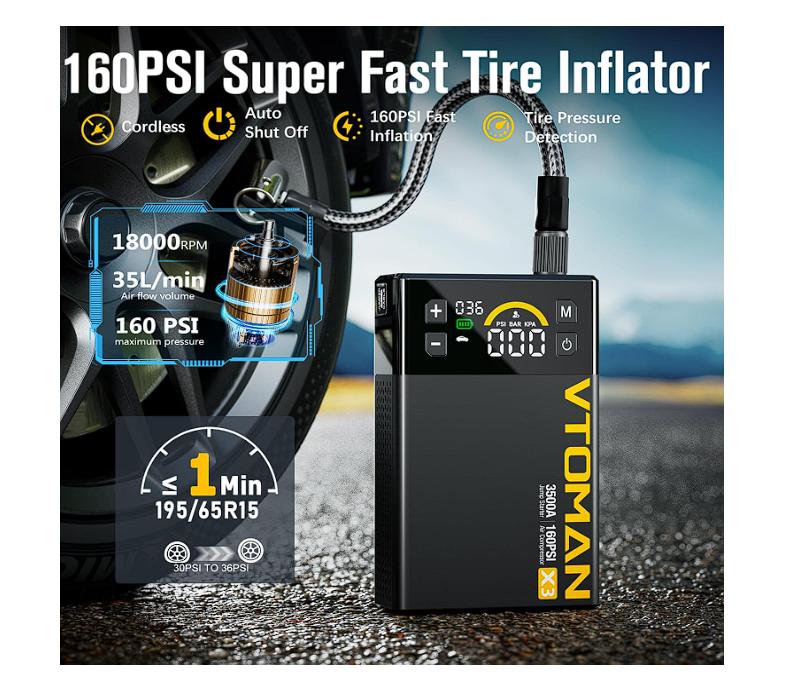 rrancador de coche todo en uno: el arrancador portátil de coche VTOMAN X3 con compresor de aire combina arranque, inflado de neumáticos, una luz LED, alarma SOS y carga USB para smartphones, tabletas y otros dispositivos. El paquete de batería arrancador X3 es tu compañero definitivo para viajes por carretera y emergencias
