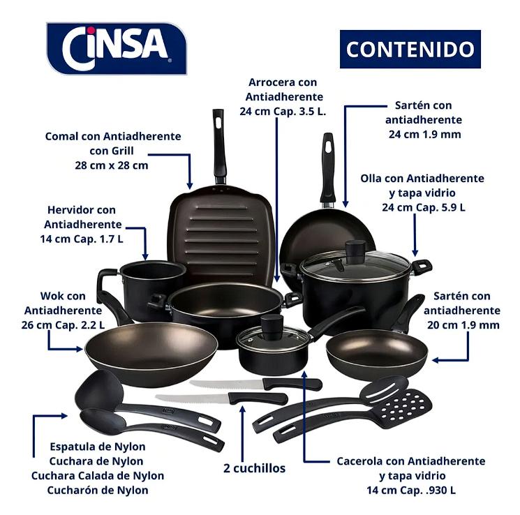 Batería de 16 piezas, incluye: sartenes, ollas, cuchillos y utensilios de cocina.