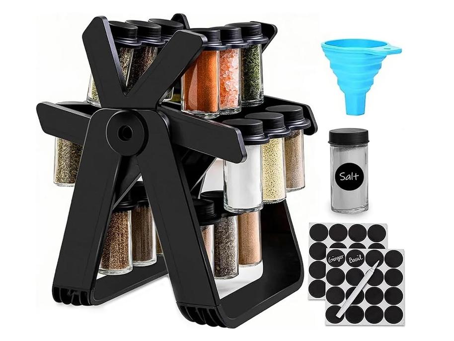 Transforma tu cocina en un espacio moderno, funcional y perfectamente organizado con el Organizador de Especias Rotativo DEUS KITCHEN. Este completo set incluye 1 base giratoria, 18 frascos de vidrio con tapa, etiquetas para identificación y 1 embudo para rellenar fácilmente las especias, ofreciéndote una solución práctica y elegante para mantener tus condimentos siempre en orden y al alcance. La base giratoria tiene dimensiones de 26 cm de ancho x 23 cm de largo x 34 cm de alto, diseñada para ocupar el menor espacio posible en tu encimera o repisa. Gracias a su rotación de 360°, podrás acceder a cualquier especia con un solo movimiento, optimizando tiempo y espacio en tu cocina. Cada frasco tiene una medida de 5 cm de diámetro x 9.5 cm de alto y está fabricado en vidrio resistente, ideal para conservar el aroma, sabor y frescura de tus ingredientes.