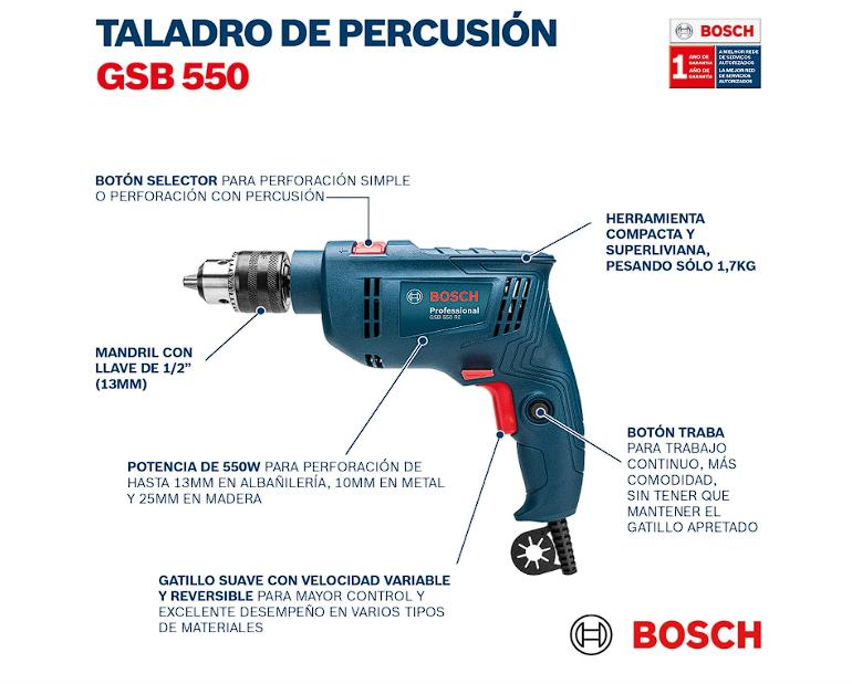 El rotomartillo Bosch GSB 550 RE, con potencia de 550 W, es la mejor elección para quien busca la confianza de la marca Bosch por un precio imbatible. Confortable, con apenas 1.7 kg, perfora albañilería, madera y metal, con y sin impacto, gracias al botón conmutador. Realice también, atornillados a través de la función de reversión y realice trabajos continuos con la ayuda del botón de bloqueo. Listo para el trabajo, ya viene con 34 accesorios